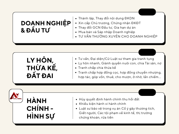 Công ty Luật AV Counsel xin trân trọng gửi tới các Quý khách hàng về bảng báo giá dịch vụ tư vấn pháp luật trong lĩnh vực TƯ VẤN VÀ TRANH TỤNG áp dụng 2022 - 2024, cụ thể như sau: