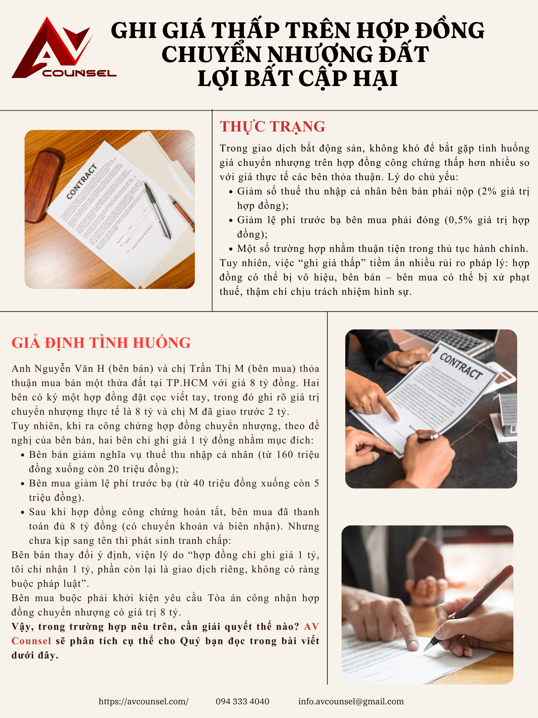 Trong các giao dịch bất động sản, không khó bắt gặp các tình huống giá chuyển nhượng thực tế thấp hơn giá trên hợp đồng chứng, điều này tiềm ẩn nhiều rủi ro pháp lý. AV Counsel sẽ phân tích cụ thể cho bạn đọc qua bài viết sau đây.