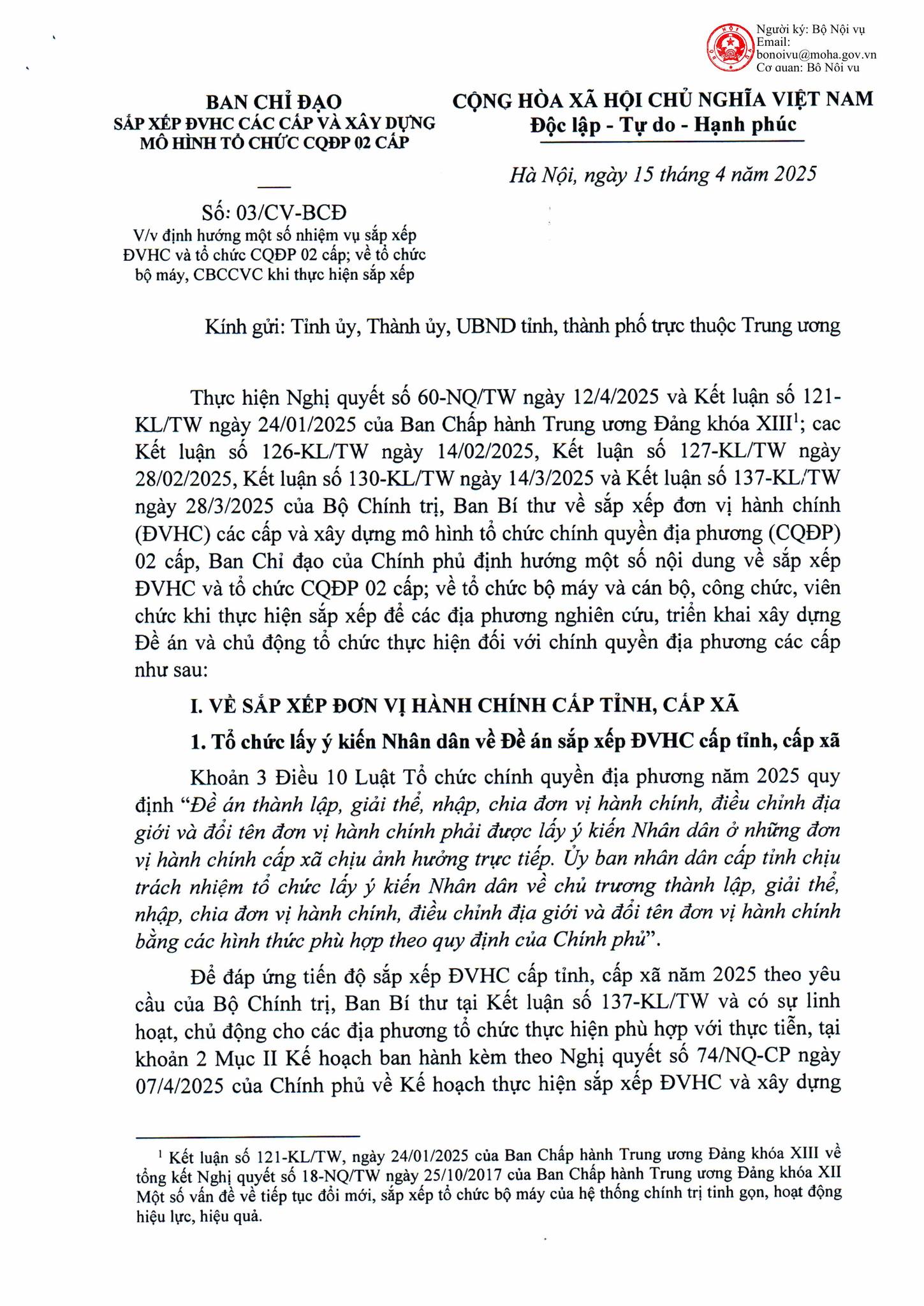 ĐỊNH HƯỚNG SẮP XẾP ĐƠN VỊ HÀNH CHÍNH VÀ TỔ CHỨC CHÍNH QUYỀN ĐỊA PHƯƠNG THEO CÔNG VĂN SỐ 03/CV-BCĐ NGÀY 15/4/2025